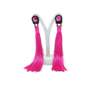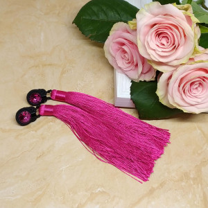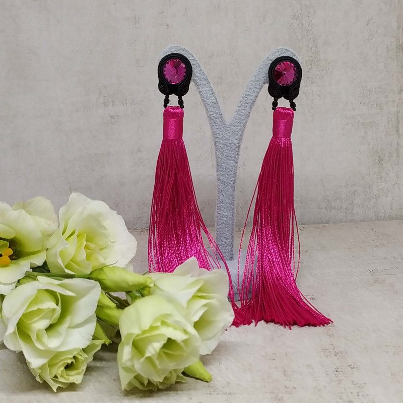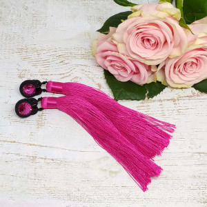 Oplecione czarnymi pasmami sutaszu różowe (fuchsia) kryształy Swarovski umieszczone zostały na wkrętkach ze stali chirurgicznej. Zwiewne chwosty w kolorach pasujących do kryształków dodają im lekkości i powabu i przyciągają spojrzenia.