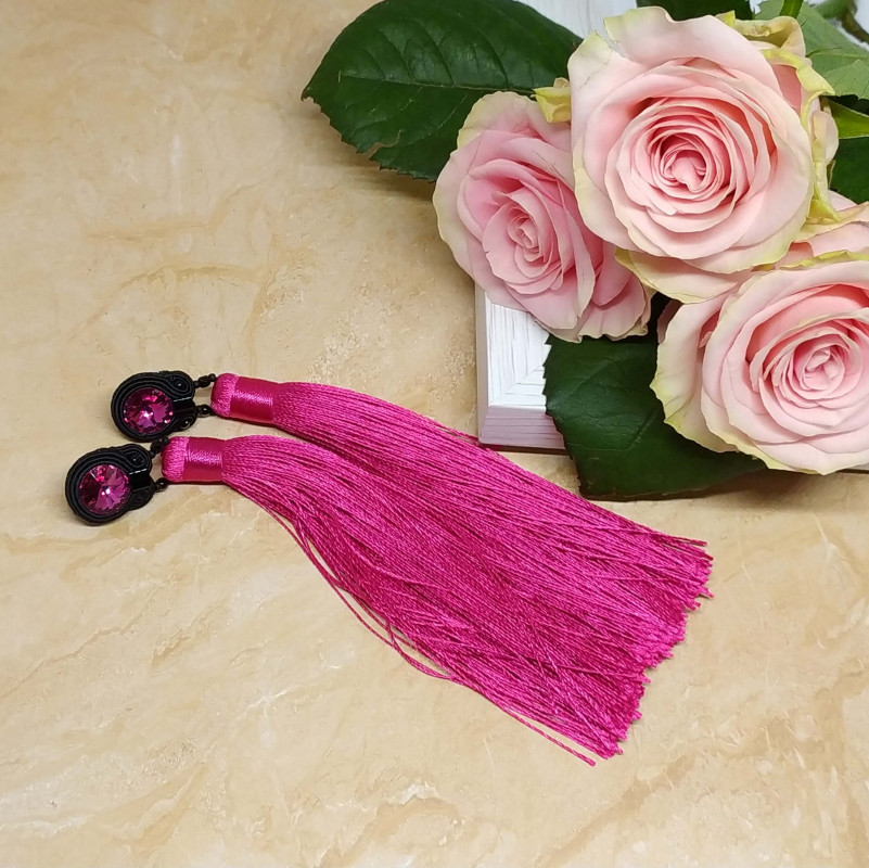 kryształy Swarovski fuchsia (mocny róż), czarne pasma sutaszu, sztyfty ze stali chirurgicznej