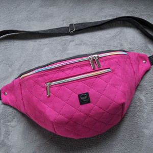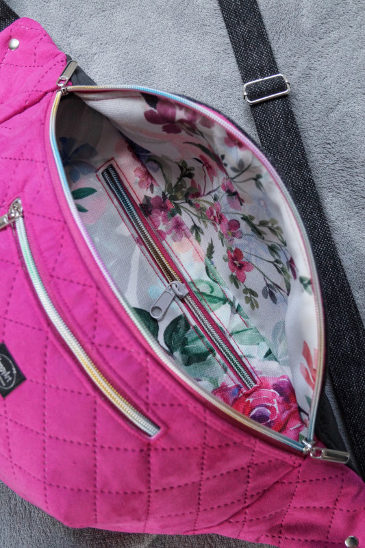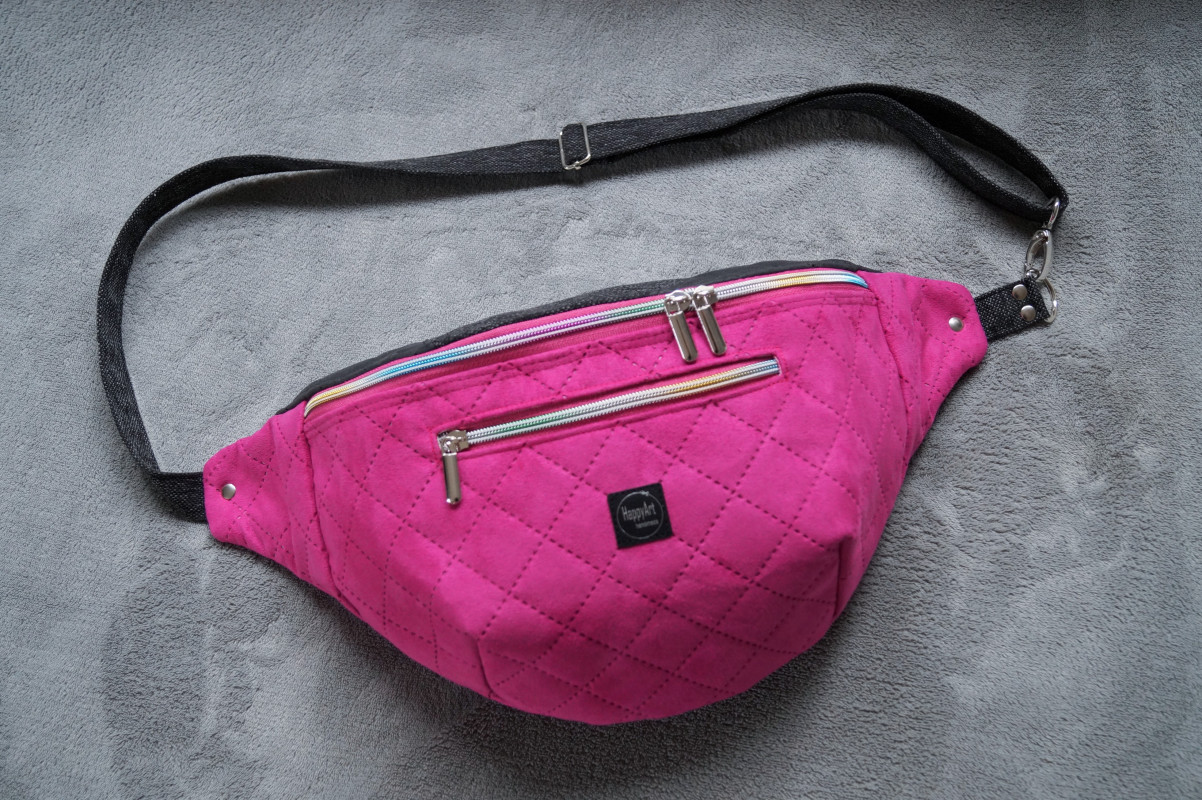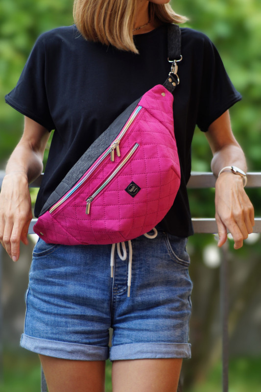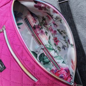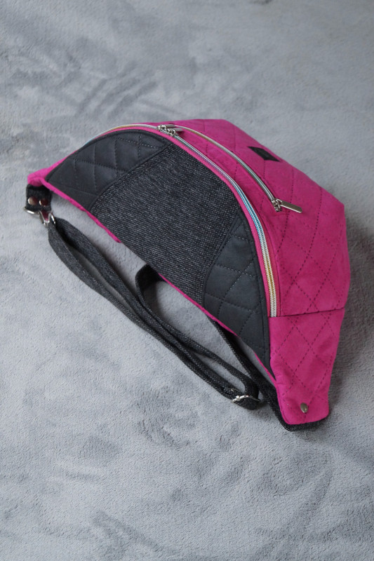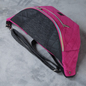 Duża nerka do noszenia na ukos, wykonana z różowej pikowanej tkaniny tapicerskiej imitującej zamsz, z czarnej tkaniny tapicerskiej imitującej matową starą skórę oraz z czarno-szarej melanżowej tkaniny tapicerskiej imitującej len.
