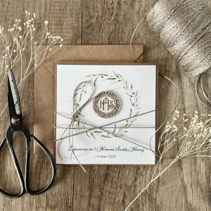 Wyjątkowe zaproszenia komunijne o wymiarze 14x14cm z pełną personalizacją. Baza kartki brązowa z papierem z fakturą lnu. W środku wklejona kartka z papieru z fakturą lnu z nadrukiem treści zaproszenia.