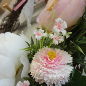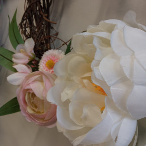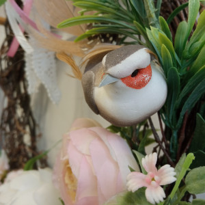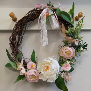 Wianek wykonany na własnoręcznie wyplatanym okręgu z brzozowych gałązek, o średnicy ok 32 cm, z wysokiej jakości sztucznych kwiatów.