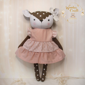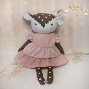 Przeurocza przytulanka, sarenka w wersji dziewczęcej, uszyta ręcznie z najwyższą starannością, ubrana w różową sukieneczkę w kropeczki, z falbankami. Wykonana ze 100% bawełny, wypełniona antyalergiczną kulką silikonową. Oczka i nosek malowane wodoodpornym markerem. Sukieneczkę można swobodnie zdejmować - jest zapinana na rzep. Górne i dolne łapki układają się luźno, sarenka siedzi z podparciem.
