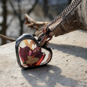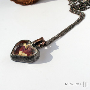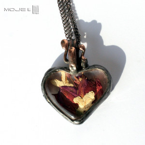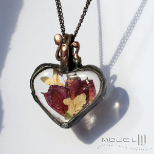 Wisior-zielnik w kształcie serca. Suszone kwiaty fuksji i białego bzu zamknięte są między dwoma taflami bezbarwnego szkła. Górne szkło wytopiłam metodą fusingu w kilkuset stopniach i dzięki temu jest lekko wypukłe. Całość oprawiona jest w miedź - cynowaną, patynowaną i przecieraną. Wisior zawieszony jest na podwójnym łańcuszku w kolorze grafitowym. Intensywność barw suszonych kwiatów z czasem może być mniejsza, jest to naturalny proces.