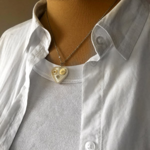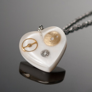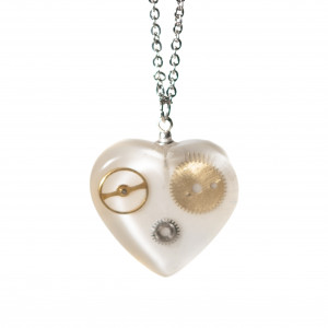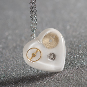 Ten wisior wykonałam z żywicy, w której zamieściłam odzyskane trybiki zegarków mechanicznych. Nadałam mu kształt serca i dodałam białe tło. Całość wykonałam ręcznie, wypolerowałam na wysoki połysk.Serduszko ma rozmiar 22x23mm, głębokość 6mm. Długość łańcuszka ze stali szlachetnej 50cm. Wisior jest niepowtarzalny, może stać się świetnym prezentem dla ukochanej osoby.