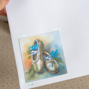 Do kartki przynależy też koperta z tym samym motywem. Dodatkowo koperta ozdobiona mini rameczką i serduszkiem - ręcznie malowane metalizującą farba.