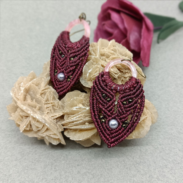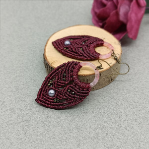 Materiał ten jest trwały, nie zmienia koloru pod wpływem czynników zewnętrznych oraz nie odkształca się pod wpływem noszenia. Kolczyki w kolorze bordowym osadzone zostały na kółku z żywicy i zawieszone na biglach otwartych w kolorze oliwkowym ze stali chirurgicznej. Ozdobione zostały małymi koralikami Toho w kolorze starego złota i szklaną perełką. Są bardzo lekkie i pasują do każdej stylizacji na każdą porę dnia. Długość kolczyka z biglem ok. 7,5 cm, szerokość 3,2 cm.