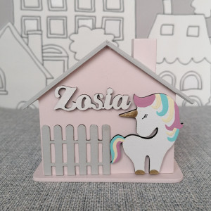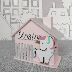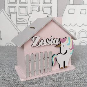 Z przodu skarbonki znajduje się płotek i ręcznie malowany dekor. Na górze w widocznym miejscu widnieje drewniany napis z imieniem dziecka.