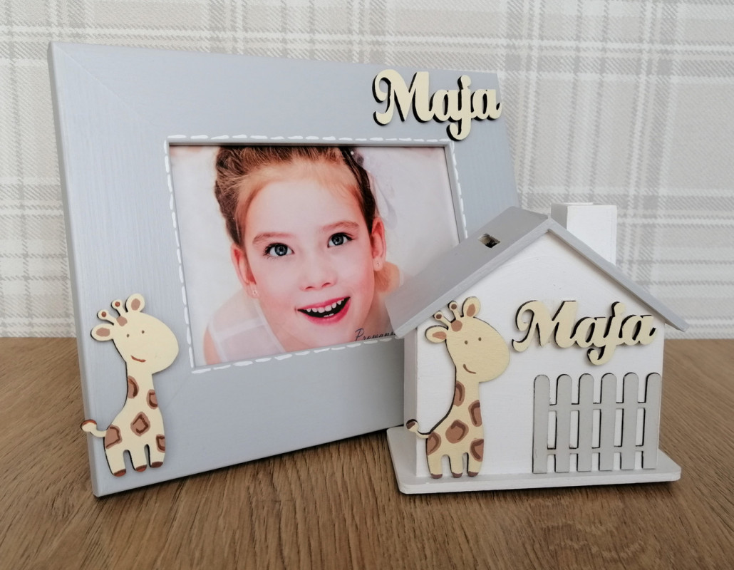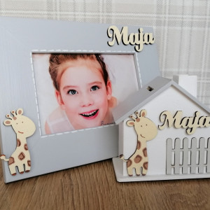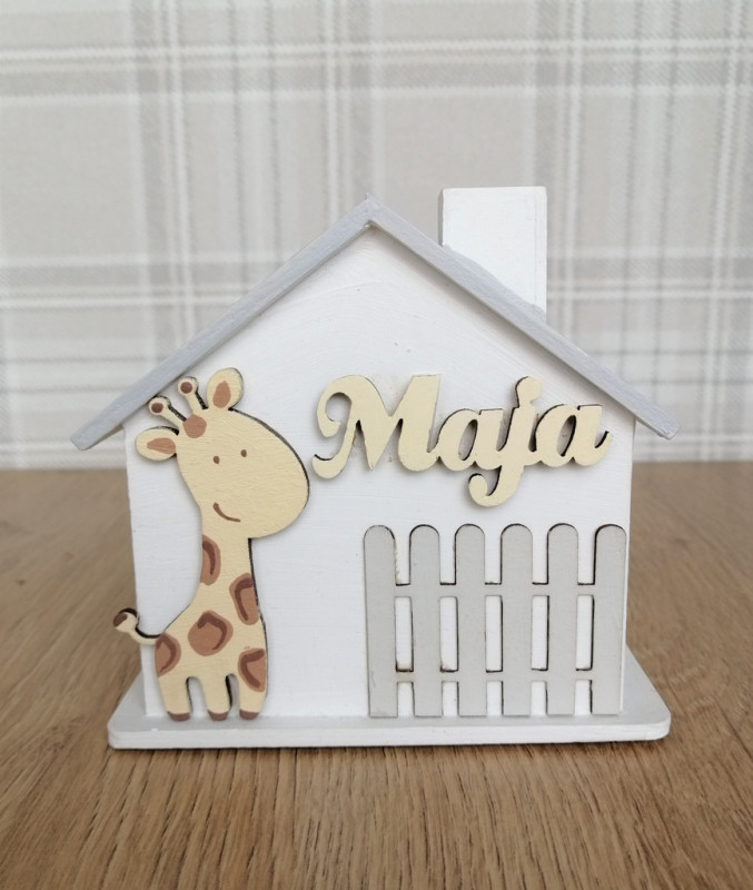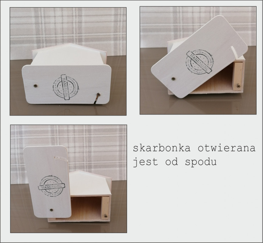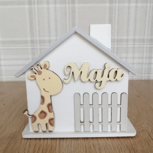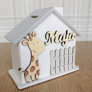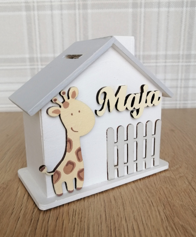 Z przodu skarbonki znajduje się płotek i ręcznie malowany dekor. Na górze w widocznym miejscu widnieje drewniany napis z imieniem dziecka. W uwagach prosimy o podanie jakie imie ma być wykonane na skarbonce.