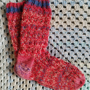 Skarpety wykonane ręcznie na drutach z wełny skarpetkowej (z dodatkiem poliamidu), z podwójnej nitki. Są wyjątkowo ciepłe.