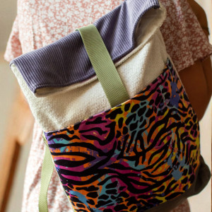 Duży, damski plecak miejski składany i zapinany na rzep wykonany z kilku rodzajów tkanin.