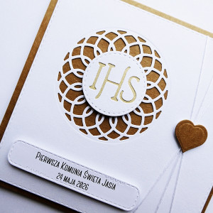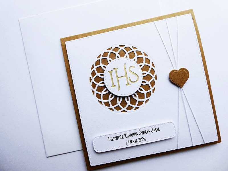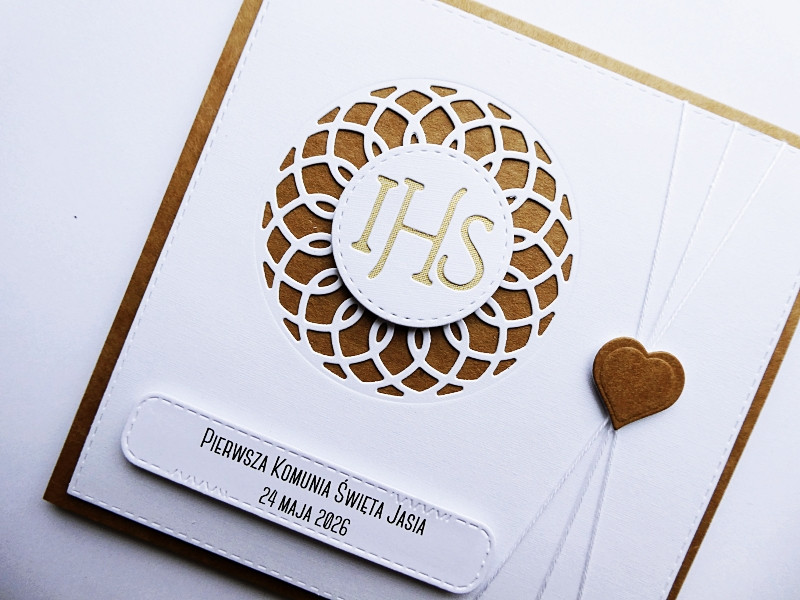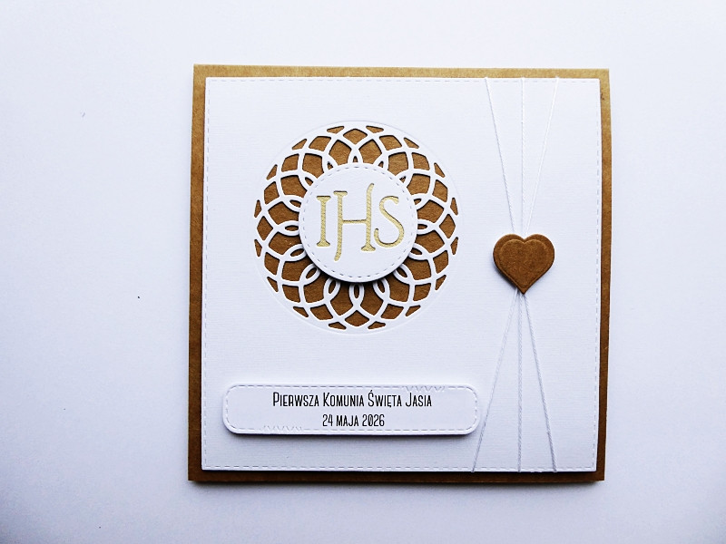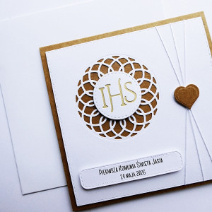 Z religijnym akcentem - umieszczoną centralnie Hostią oraz ozdobnym białym sznurkiem udekorowanym papierowym serduszkiem.