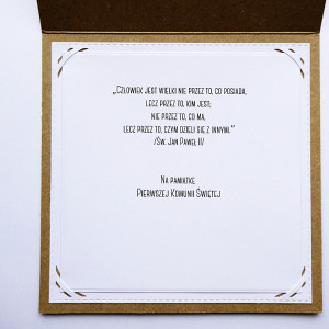 Pamiątka jest personalizowana - imię dziecka i data uroczystości na froncie oraz gotowe życzenia wewnątrz.
