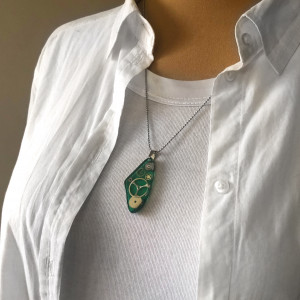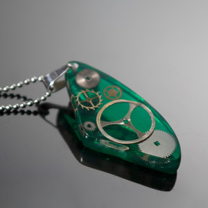 Ten wisior wykonałam z żywicy, w której zamieściłam odzyskane trybiki zegarków mechanicznych. Dla podniesienia kontrastu dodałam morskie tło. Całość wykonałam ręcznie, wypolerowałam na wysoki połysk. Wisior ma kształt skrzydła motyla w rozmiarze 44x21mm, głębokość 5mm. Długość łańcuszka ze stali szlachetnej 65cm. Wisior jest niepowtarzalny, może stać się świetnym prezentem dla ukochanej osoby.