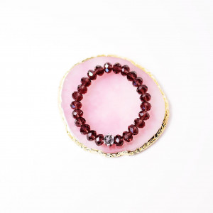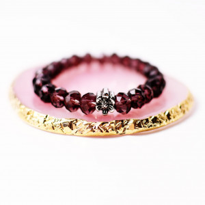 Bransoletka na silikonowej gumce, wykonana ze śliwkowych kryształków w kształcie fazowanych oponek średnicy ok. 8 mm z przekładką w kształcie kwiatka ze stali chirurgicznej.