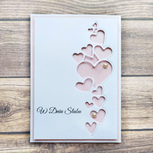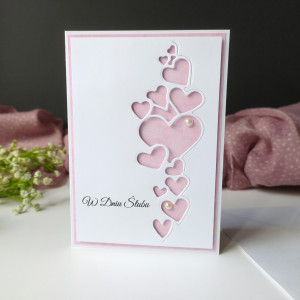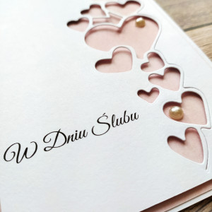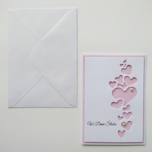 Wykonana ręcznie kartka na Ślub z sercami. Delikatna i romantyczna. W komplecie koperta i ochronna folia. Wymiary 10,5 na 14,8 cm. Istnieje możliwość dodania spersonalizowanego napisu. Kolor różowego tła może nieznacznie się różnić od przykładu, w zależności od dostępności materiałów.