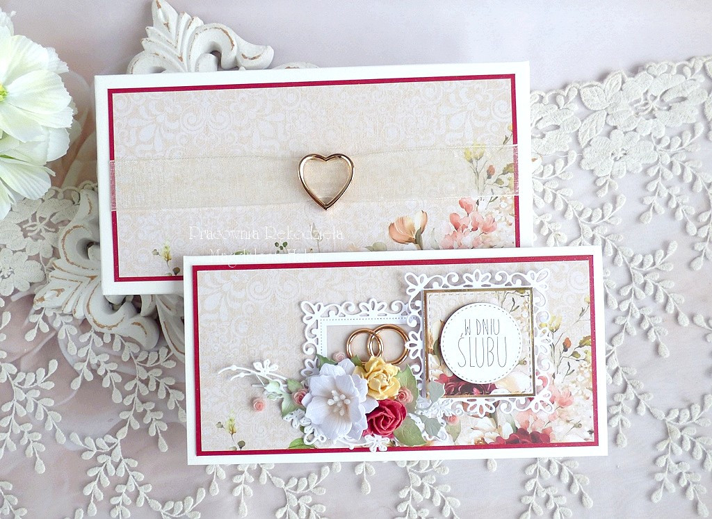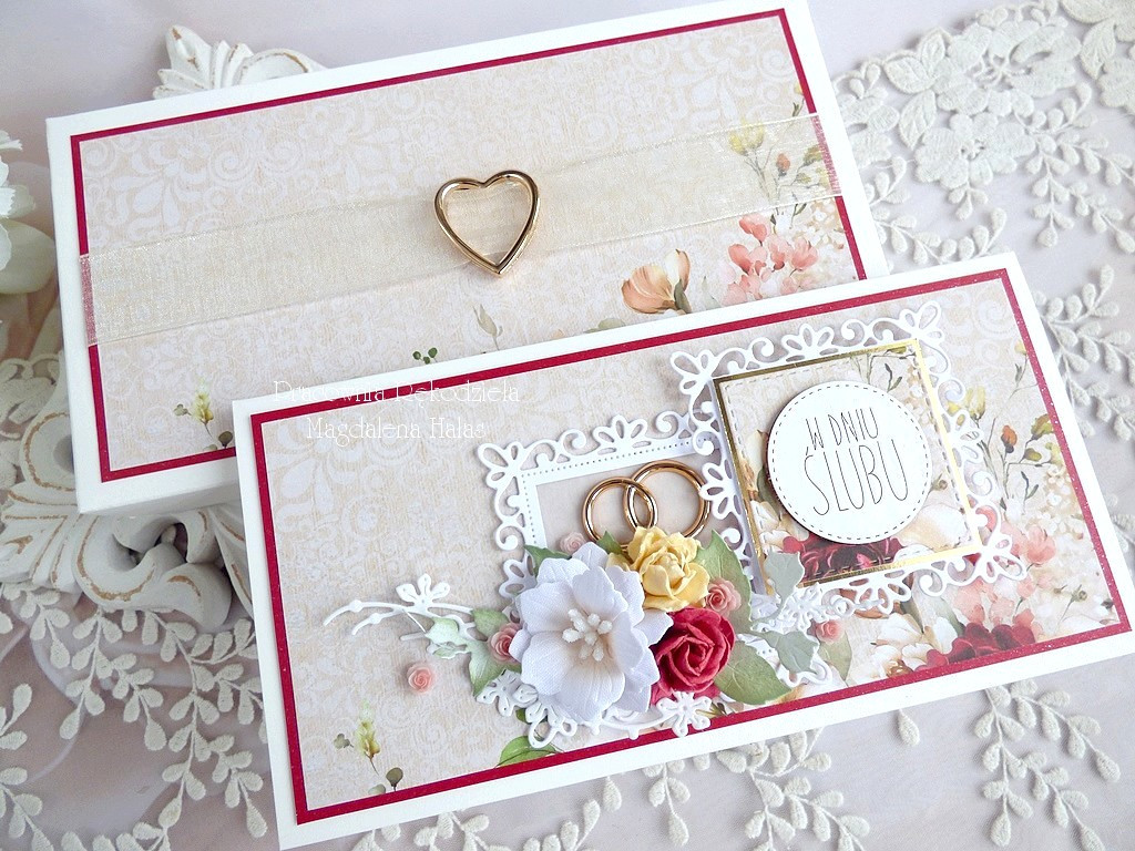 Warstwowa, bogato zdobiona kartka na ślub udekorowana ślicznymi papierami scrapowymi polskich producentów, ażurowymi ramkami, kwiatami oraz innymi dodatkami.