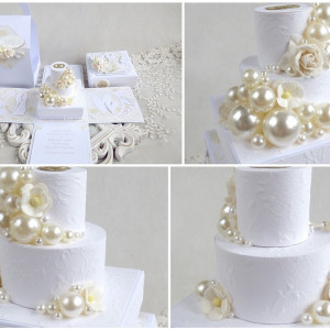 Komplet ozdobiony jest pięknymi papierami scrapowymi i tłoczonymi polskich producentów, kwiatami, tortem oraz małym pudełkiem na pieniądze lub drobny prezent o wymiarach: 8x8x3 cm