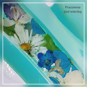 Po brzegi ręcznie wypełniona prawdziwymi kwiatami : stokrotkami, hortensją, niezapomjnajkami i liściami paproci.