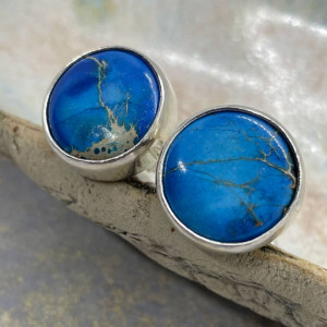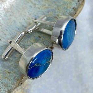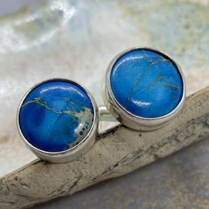 Okrągłe spinki do mankietów wykonane zostały ze srebra próby 925 i niebieskich jaspisów cesarskich. Oryginalne wybarwienie kamieni przywodzi na myśl morską toń. Srebro w procesie tworzenia było polerowane dla wydobycia z niego wyjątkowego blasku. Spinki będą stylowym uzupełnieniem męskiego stroju wieczorowego lub trafionym prezentem dla przyszłego pana młodego.