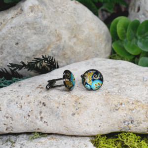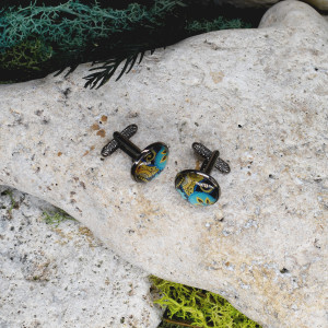 Okrągłe spinki do mankietów w czarnym kolorze ze szklanym oczkiem i abstrakcyjnym wzorem