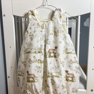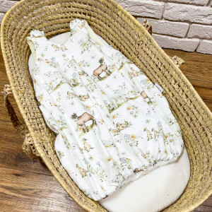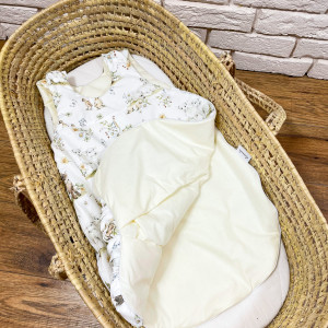 Śpiworek wykonany z 100% bawełny premium z nadrukiem, środek 100% bawełna jednokolorowa.