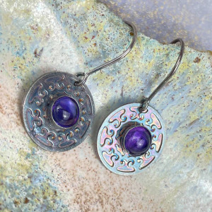 Okrągłe kolczyki zostały wykonane ze srebra próby 925 oraz wykończone ametystami o średnicy 6mm. Dodatkowo, charakteru kolczykom nadał proces czernienia i polerowania, który uwypuklił ozdobne wzory wytłoczone na powierzchni metalu.