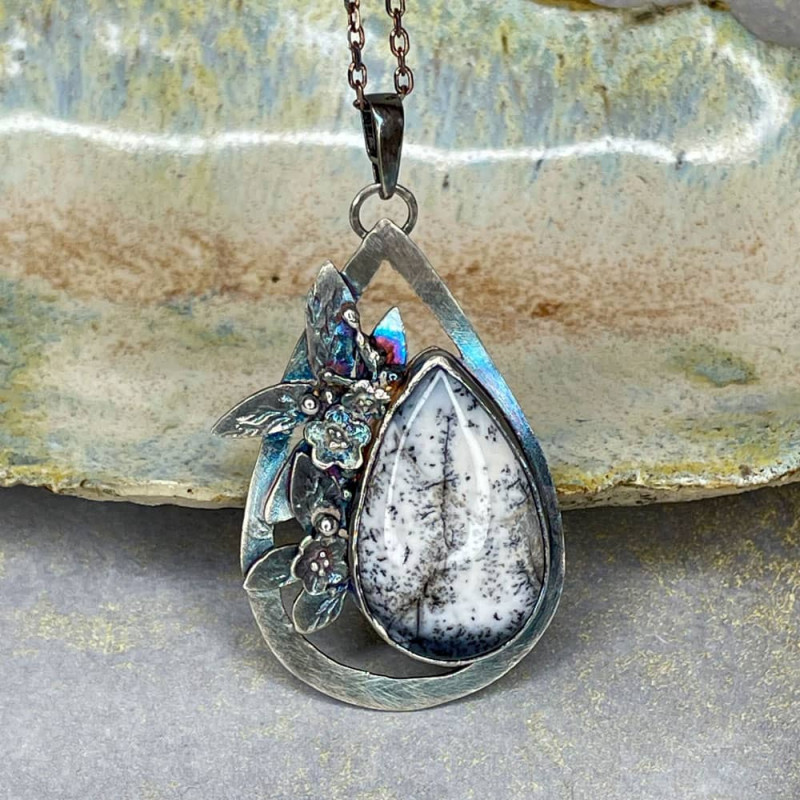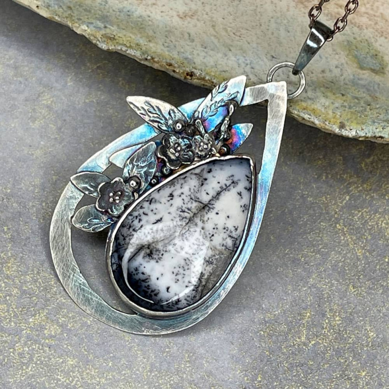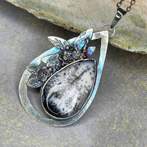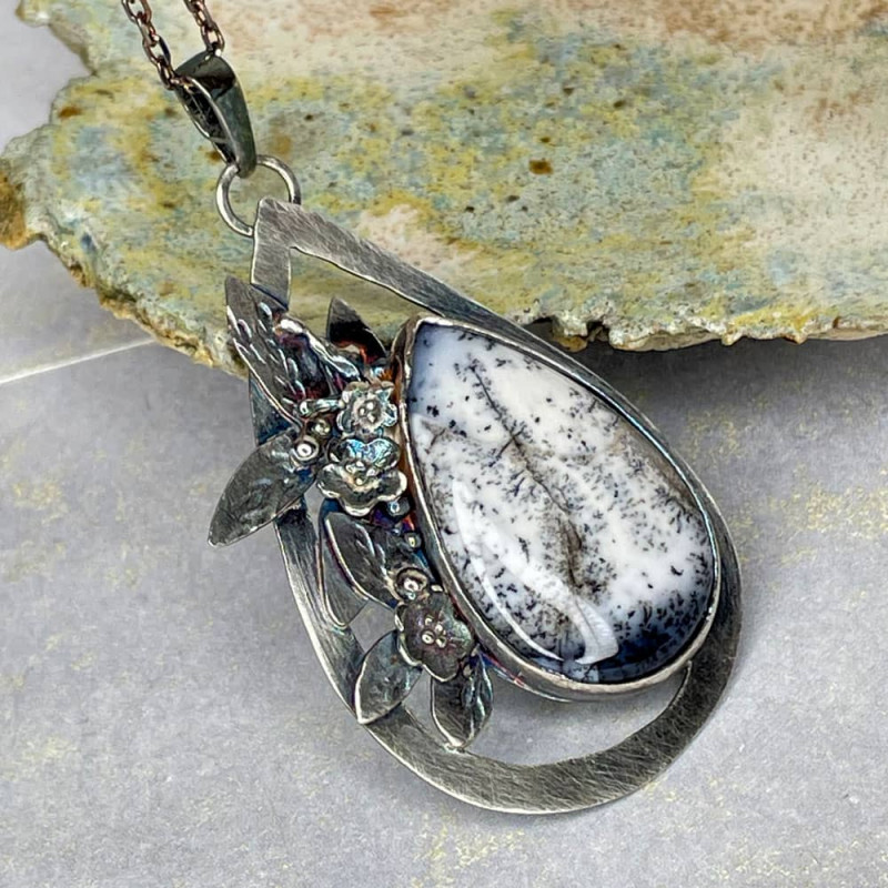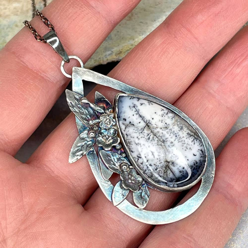Ten wyjątkowy naszyjnik z agatem dendrytowym przenosi myśli w świat zimowych poranków, kiedy delikatny szron rysuje na szybach misterne wzory. Kamień, będący sercem tej biżuterii, zachwyca niepowtarzalnym, naturalnym rysunkiem przypominającym drobne gałązki czy korzenie – jakby natura sama zostawiła w nim swój mroźny oddech. Agat został oprawiony w srebro próby 925, ręcznie formowane i zdobione roślinnymi detalami. Oksydowanie i przecieranie srebra wydobywa każdy detal oprawy, dodając jej głębi i tęczowych blasków. Całość tworzy pełen wdzięku, lekko baśniowy naszyjnik – idealny dla kobiet, które cenią delikatność, naturę i unikatowy styl. To nie tylko ozdoba – to naszyjnik, który opowiada historię o ciszy zimowego poranka, o subtelności przyrody i o pięknie, które tkwi w nieregularności.