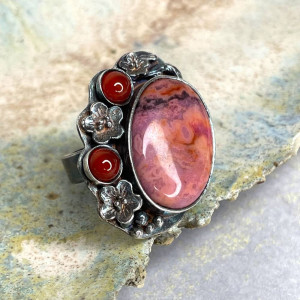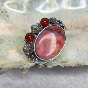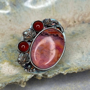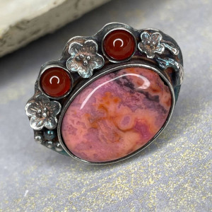 Jak malarski pejzaż inspirowany zachodzącym słońcem – agat koronkowy zachwyca subtelną grą barw, łącząc odcienie różu, pomarańczu i barw pomiędzy w jedyny w swoim rodzaju wzór. Jego ciepłe tony doskonale komponują się z intensywną czerwienią karneoli, które niczym ostatnie promienie zachodu słońca dodają kompozycji głębi i charakteru. Oksydowane srebro, ozdobione misternymi kwiatowymi detalami, podkreśla artystyczny styl biżuterii, nadając jej romantycznego, lekko baśniowego uroku