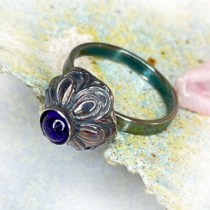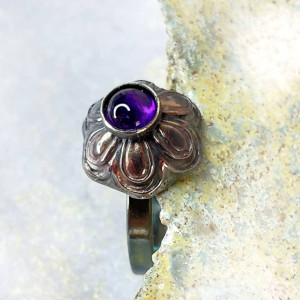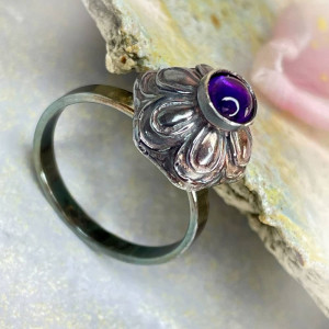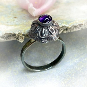 Elegancki i intrygujący pierścionek, w którym ametyst w intensywnym kolorze osadzony został w subtelnej, kwiatowej oprawie ze srebra. Ręcznie wykonana forma przypomina rozwinięty pąk, dodając całości delikatnego, ale unikalnego charakteru. Jego styl sprawia, że świetnie komponuje się zarówno z romantycznymi, jak i eleganckimi stylizacjami. Oksydowane srebro podkreśla głębię kamienia, sprawiając, że pierścień staje się zarówno wyjątkowym akcentem stylizacji, jak i dodatkiem na co dzień. To biżuteria dla osób ceniących kunszt, naturalne piękno i niepowtarzalne detale.