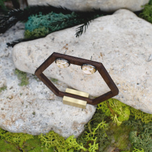 Ręcznie wykonane stalowe kolczyki w czarnym odcieniu ozdobione kaboszonami. Kaboszony z drobinkami złotej folii. Każdy kaboszon jest inny, więc twoja para może odrobinę różnić się od tej ze zdjęcia. Idealne do letnich kolorowych stylizacji boho / hippie.