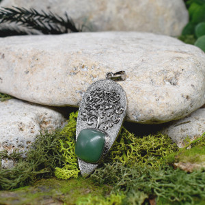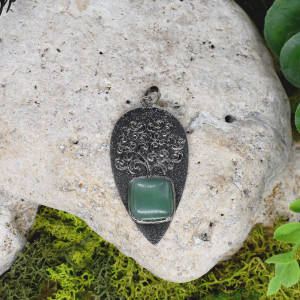 Ręcznie wykonany wisior ze stali z awenturynem. Oprawa kamienia przedstawiająca drzewo życia, polerowana, patynowana.