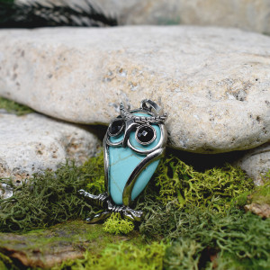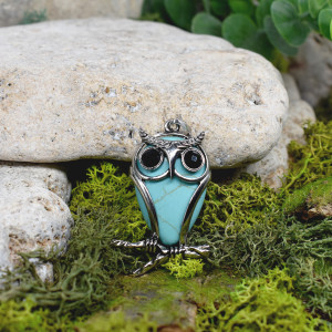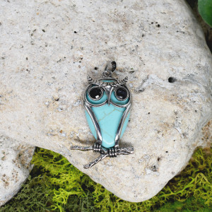 Ręcznie wykonany wisior ze stali z howlitem i obsydianem. Oprawa kamienia przedstawiająca sowę, polerowana, patynowana.