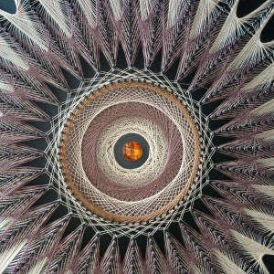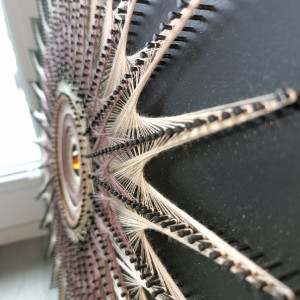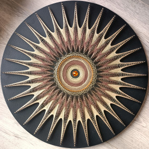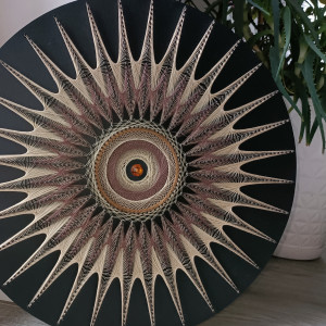 Praca wykonana na drewnianej płycie o druboci 1 cm i średnicy 40cm. Płyta pomalowana na kolor czarny mat. Kolor nici to beżowy, brązowy. Na środku naklejone brazowe szkiełko.