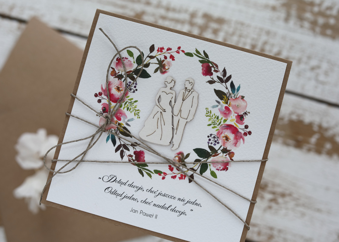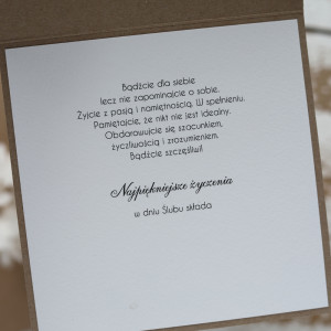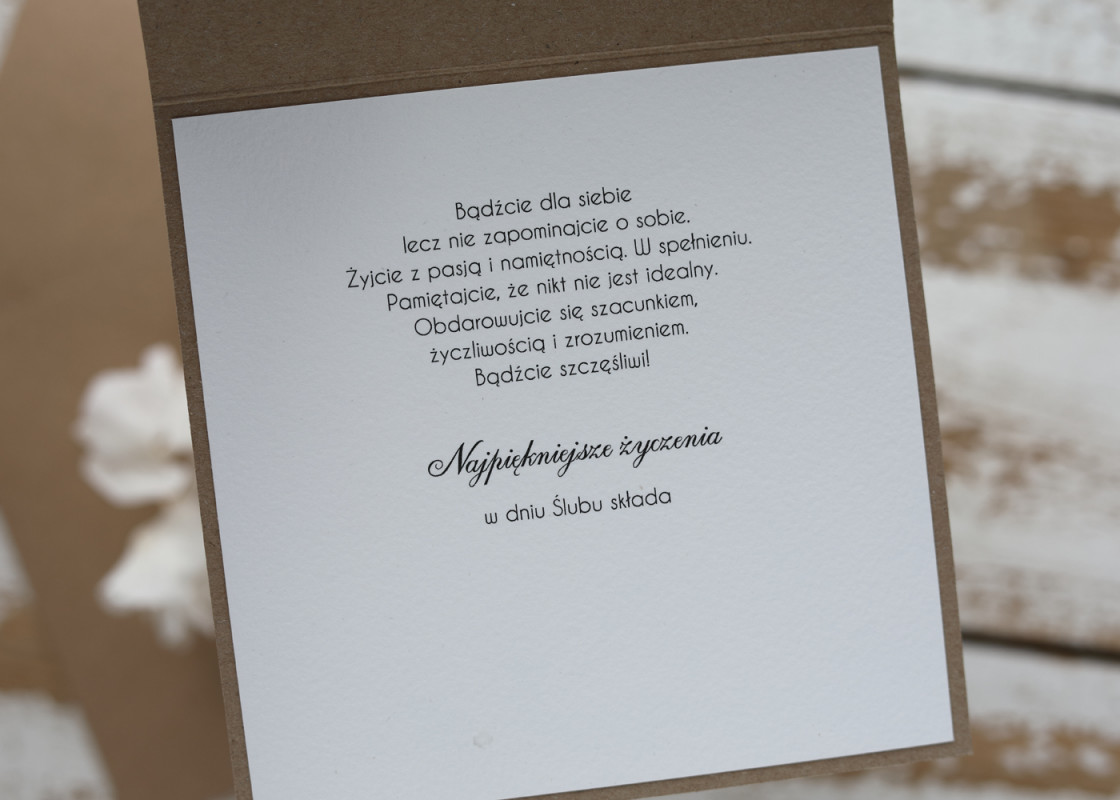 Stylowa kartka na ślub wykonana na bazie papieru kraftowego z dodatkiem starannie dobranego papieru ekologicznego bawełnianego 100% w odcieniu brzoskwini z ozdobną tekturką.