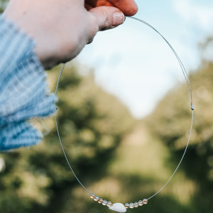 Ozdoba na szyję ręcznie wykonana z kamieni naturalnych, muszelki i z linki jubilerskiej stalowej nierdzewnej.