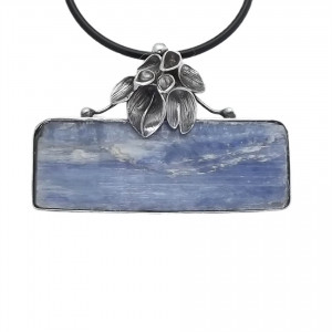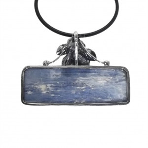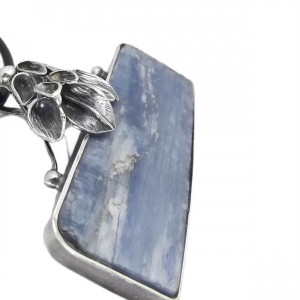 Nieoszlifowany, pełen charakteru kyanit w surowej formie, oprawiony ręcznie w srebro próby 925. Nieregularna struktura kamienia zachwyca naturalnością, a