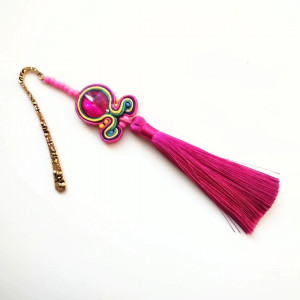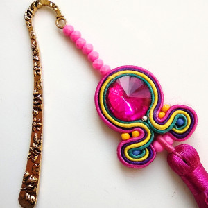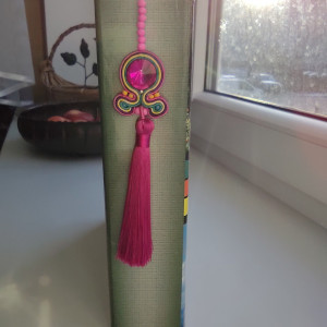 Zakładka do książki wykonana w technice haftu sutaszowego - szyje się kolorowe sznureczki milimetr po milimetrze, wszywając między nie kamienie i minerały, szkło itp.