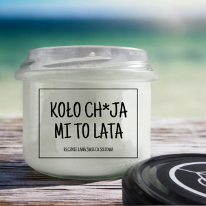 Świeca z wosku sojowego w szklanym słoju z czarnym wieczkiem z napisem KOŁO CH*JA MI TO LATA