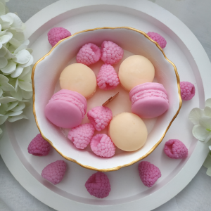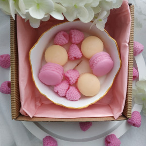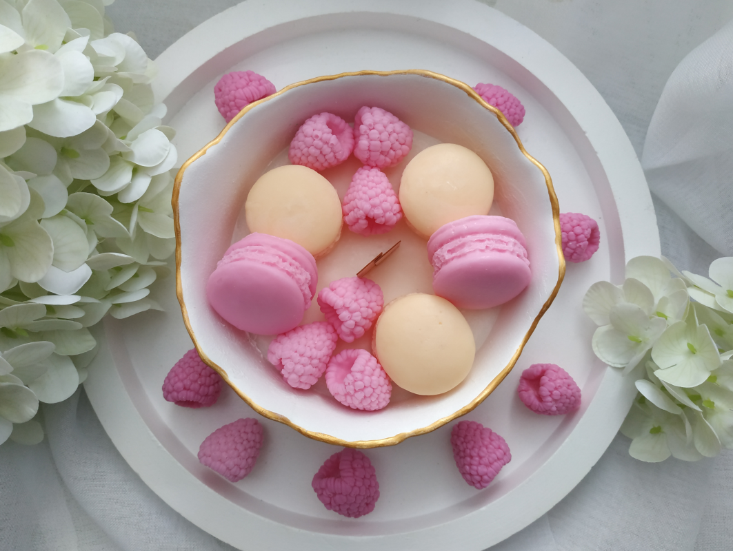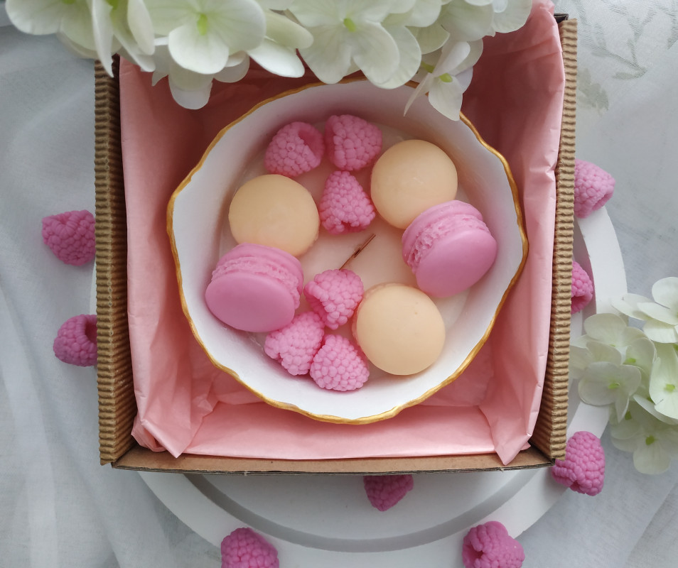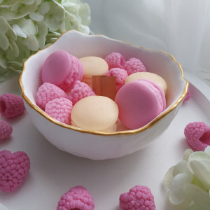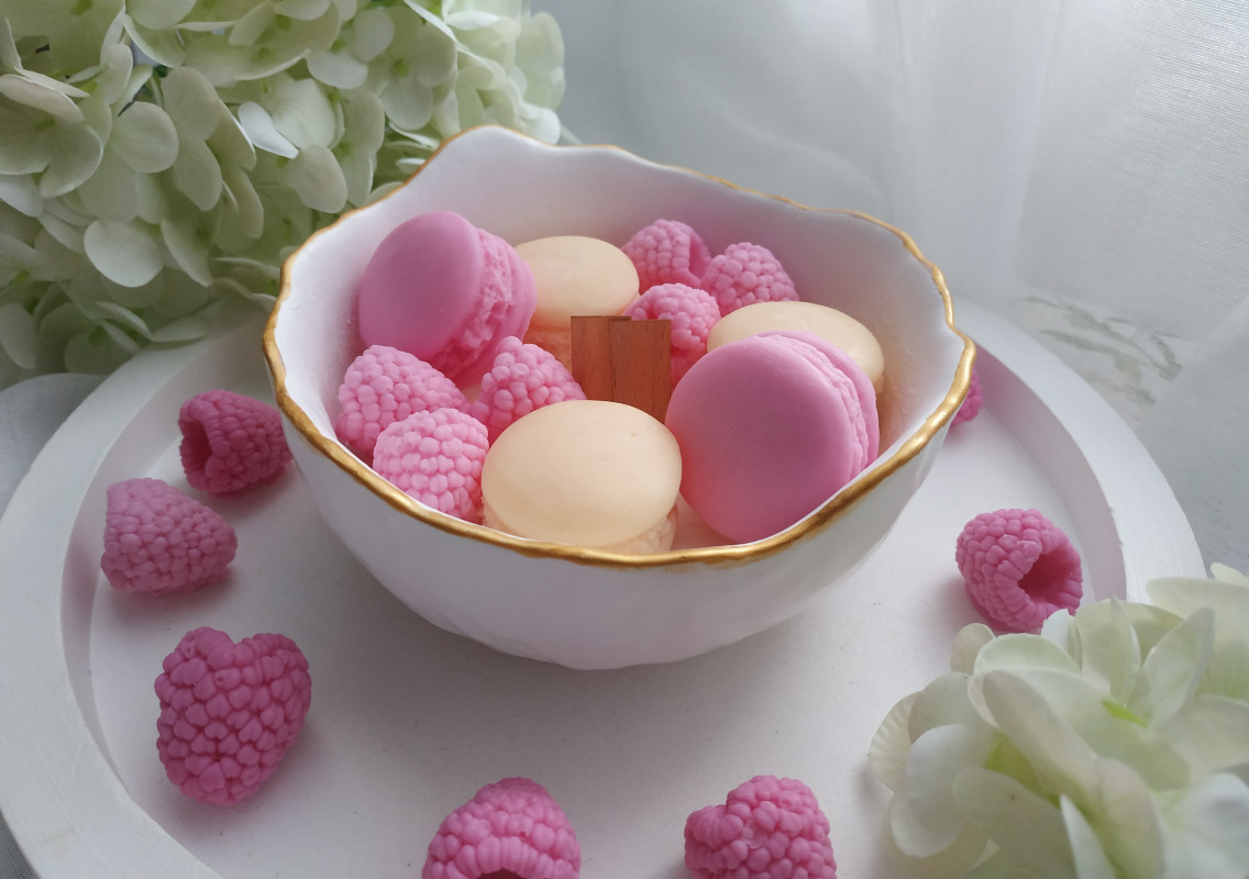 Świeca sojowa w pojemniku z gipsu ceramicznego o zapachu owoców leśnych i białej czekolady.