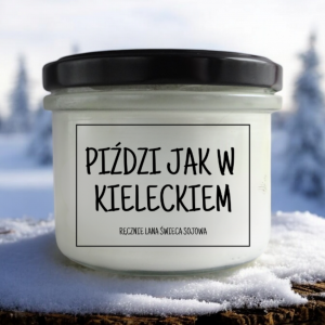 Świeca z wosku sojowego w szklanym słoju z czarnym wieczkiem z napisem PIŹDZI JAK W KIELECKIEM