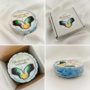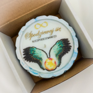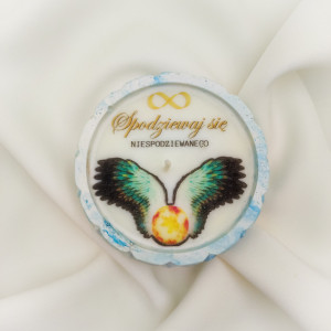 : Unikalny wzór przedstawiający Płomienną gwiazdę, która symbolizuje wolność, duchowy wzrost oraz nieprzewidywalność losu. Na świecy znajduje się motyw „Spodziewaj się niespodziewanego”, który wprowadza element tajemnicy, inspiruje do otwartości na to, co nieznane.