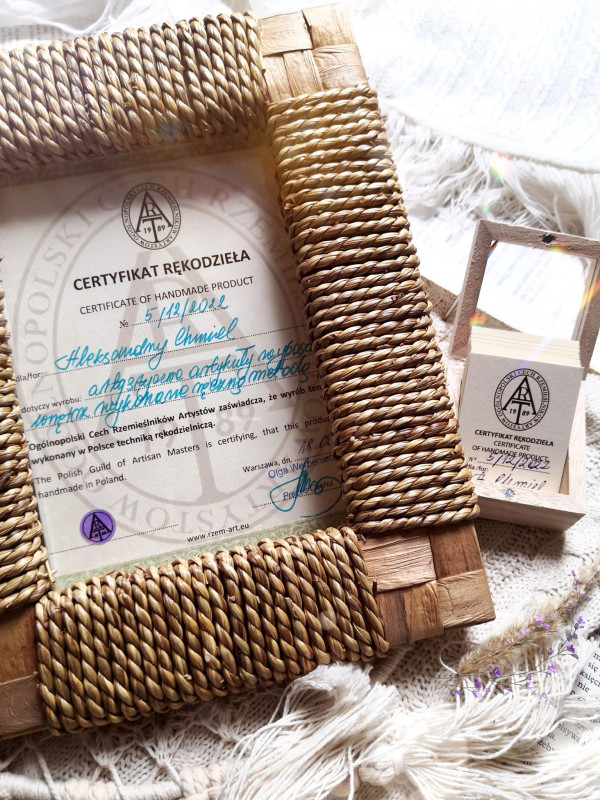 Do każdego zamówienia dołączam specjalne przywieszki, na których znajdują się dane o certyfikacie z opisem w języku polskim i angielskim, poświadczone podpisem Prezes Ogólnopolskiego Cechu Rzemieślników Artystów.