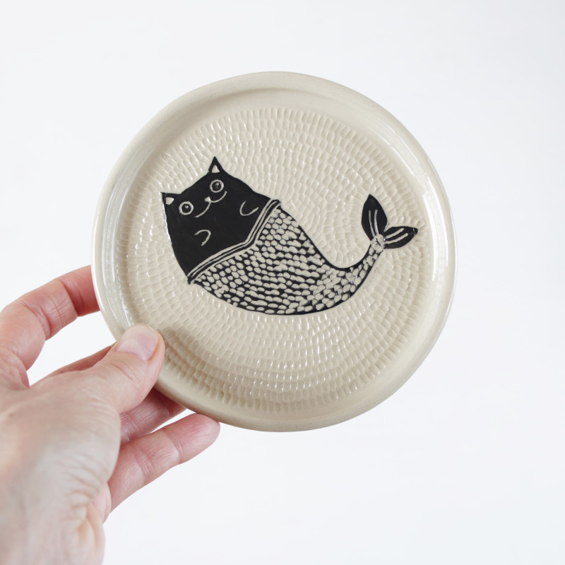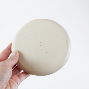 Talerzyk został wykonany ręcznie z jasnej masy ceramicznej. Wzór widoczny na naczyniu powstał techniką sgraffito.