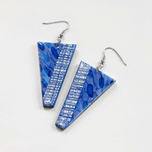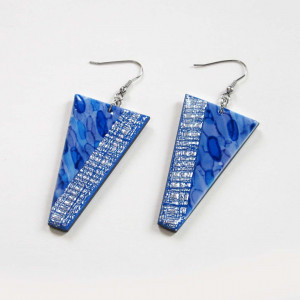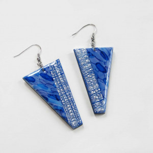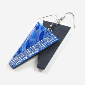 Geometryczne, wiszące kolczyki w odcieniu głębokiego błękitu i srebra, wykonane ręcznie wg autorskiego projektu. Powierzchnia kolczyków jest wykończona na wysoki połysk. Spód w kolorze matowej czerni. Elementy metalowe w kolorze srebrnym. Antyalergiczne bigle w kolorze srebrnym.