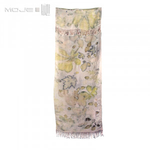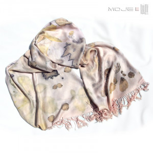 Bawełniany szal, który stał się niepowtarzalny dzięki technice, którą go ozdobiłam. Jest to druk ekologiczny, w którym wykorzystuje się naturalne barwniki zawarte w roślinach - liściach, kwiatach, korze itp. Odpowiednia "obróbka" sprawia, że barwniki wnikają w tkaninę i pozostawiają na niej rysunek. Proces ten jest długotrwały (może trwać kilka dni), zawsze niepowtarzalny i efekt końcowy można przewidzieć w bardzo niewielkim stopniu.