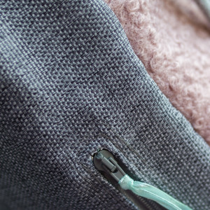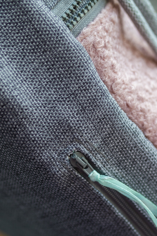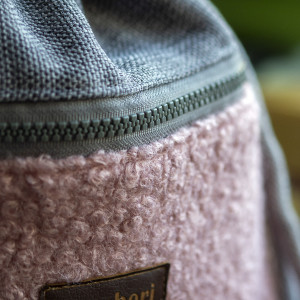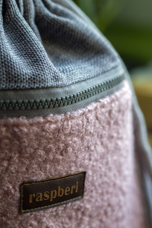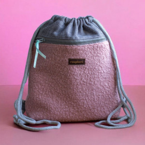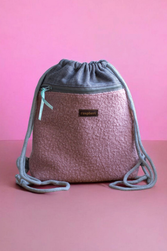 Plecak worek wykonany z szarej tkaniny. Z przodu duża kieszeń zapinana na suwak z różowej tkaniny typu baranek. Z tyłu plecaka (z boku, na dole) mała zapinana kieszonka.
