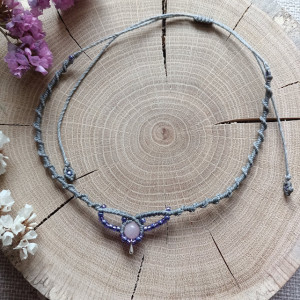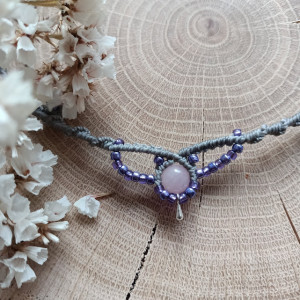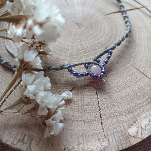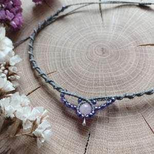 Naszyjnik z naturalnym kamieniem - jadeitem oraz szklanymi koralikami, wykonany w technice mikromakramy w całości ręcznie, z serca i z dbałością o każdy szczegół. Pleciony z bardzo wytrzymałego, woskowanego sznurka w kolorze szarym, odpornym na wycieranie, pękanie oraz promienie słoneczne. Nie blaknie pod wpływem czasu.