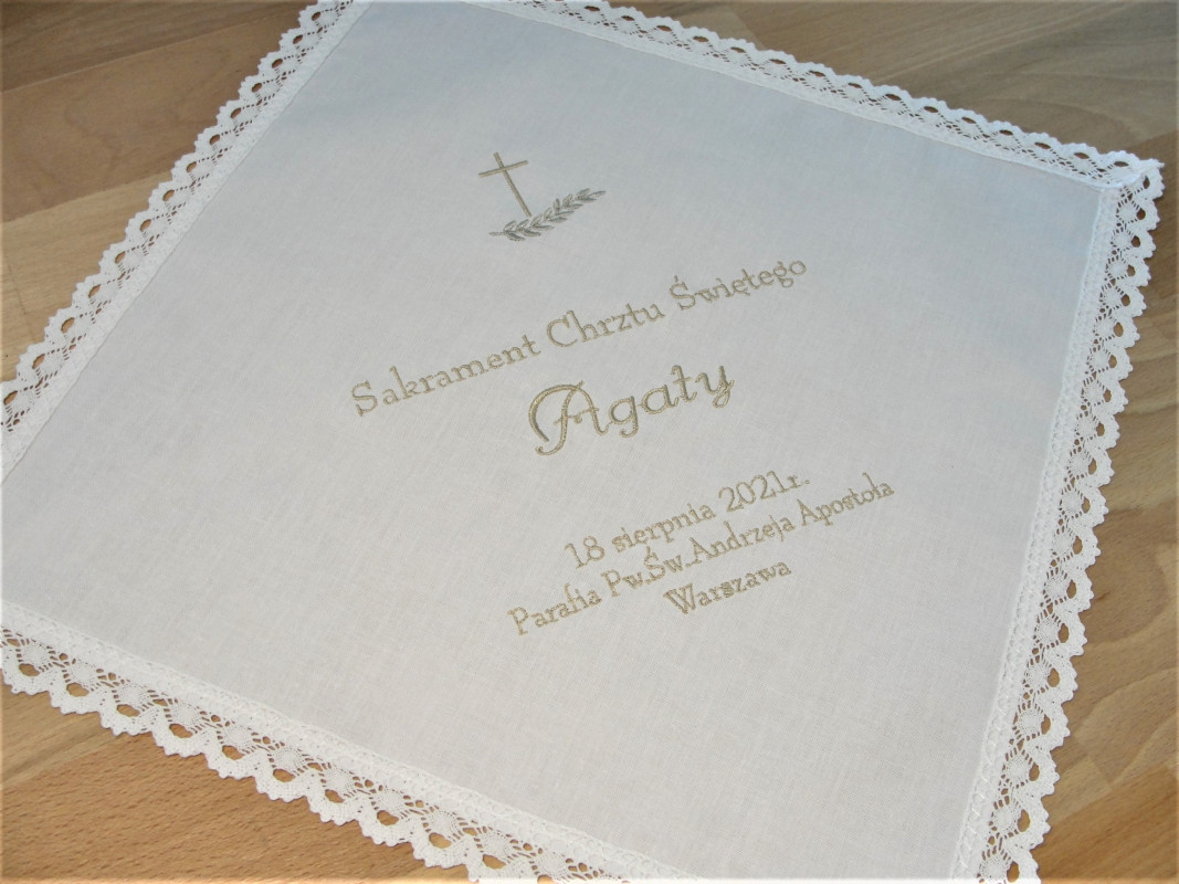 Szatka do chrztu wykonana z tkaniny bawełnianej, z haftem w kolorze oliwkowym i delikatnego złota, obszyta koronką bawełnianą.