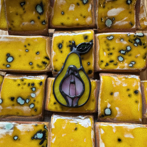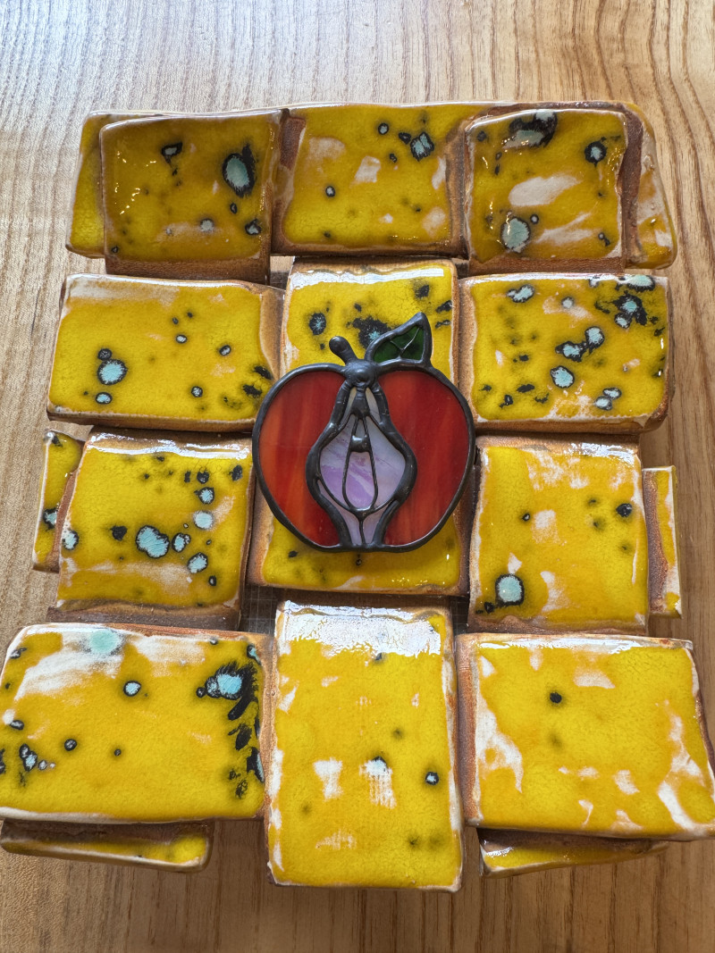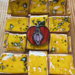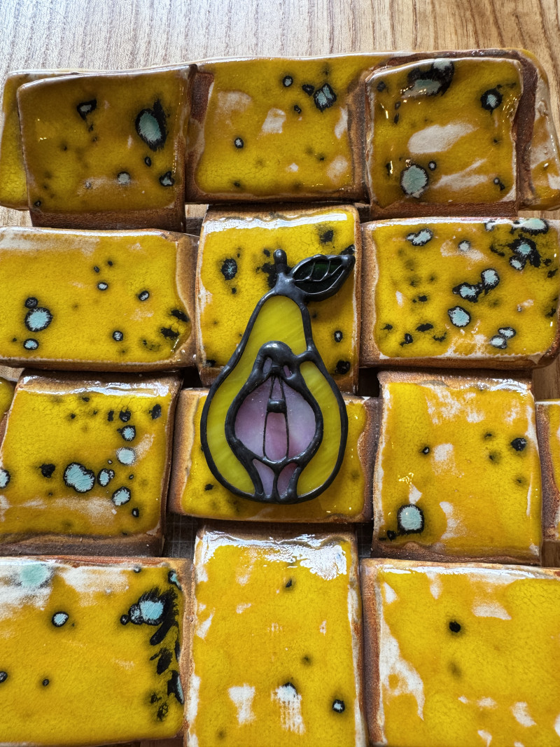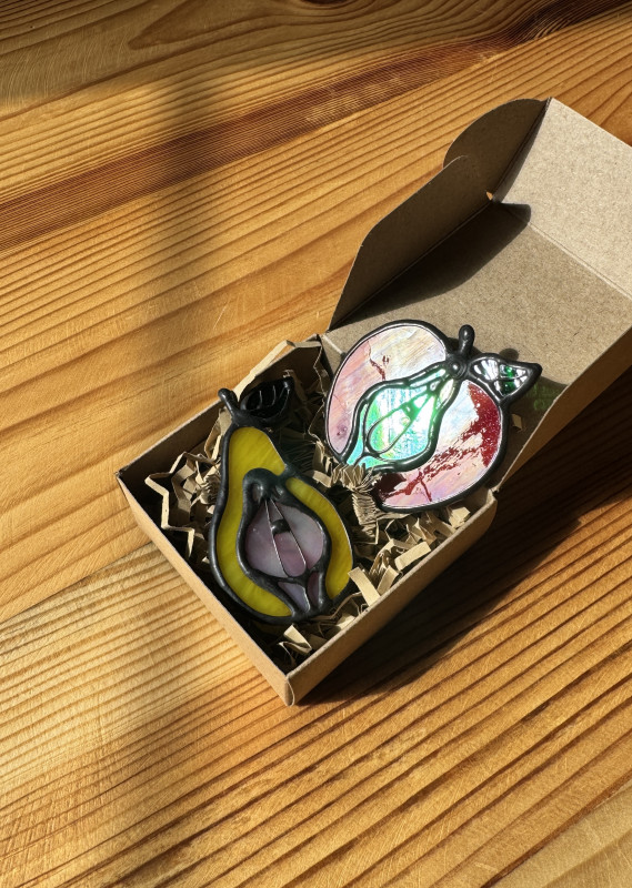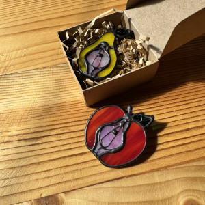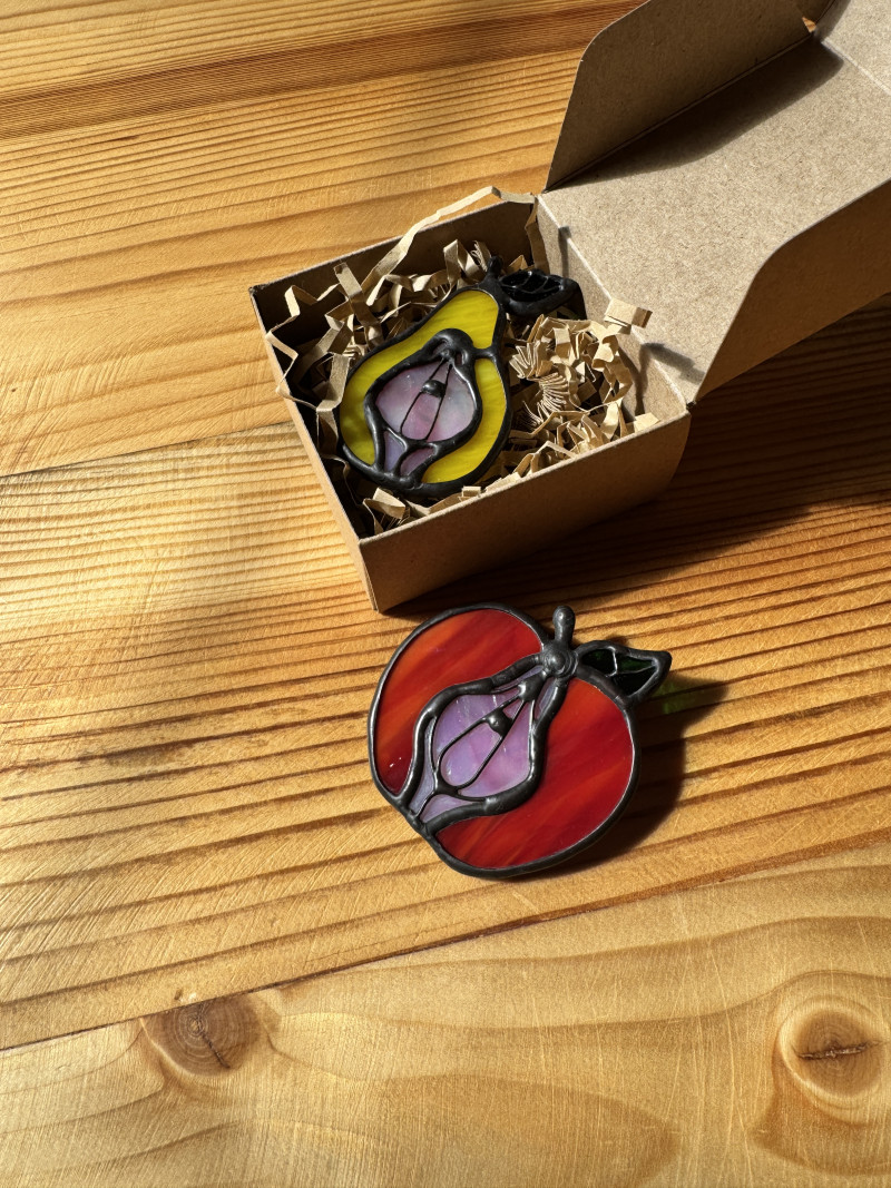 Szklana broszka Owoc Jabłko Gruszka Łono Symbol kobiecości. Witraż