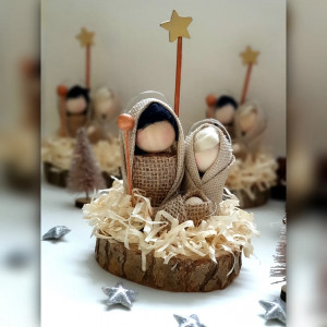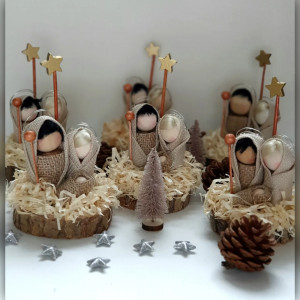 Szopka betlejemska na plastrze drewna, wykonana z naturalnych materiałów. Wielkość to ok 13x15 cm.